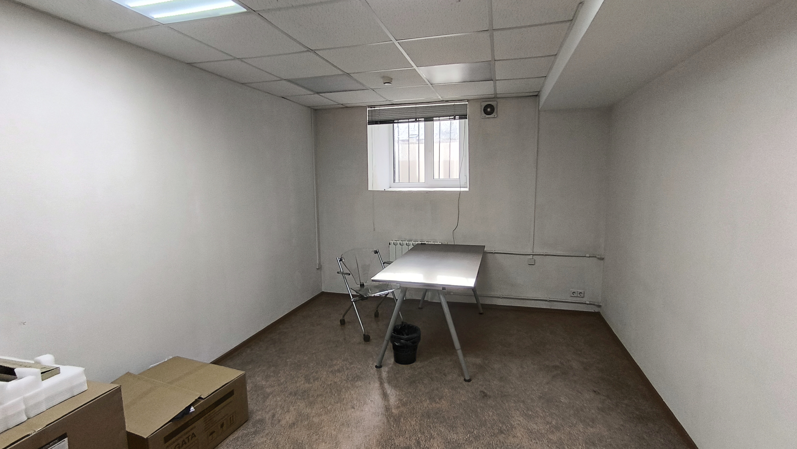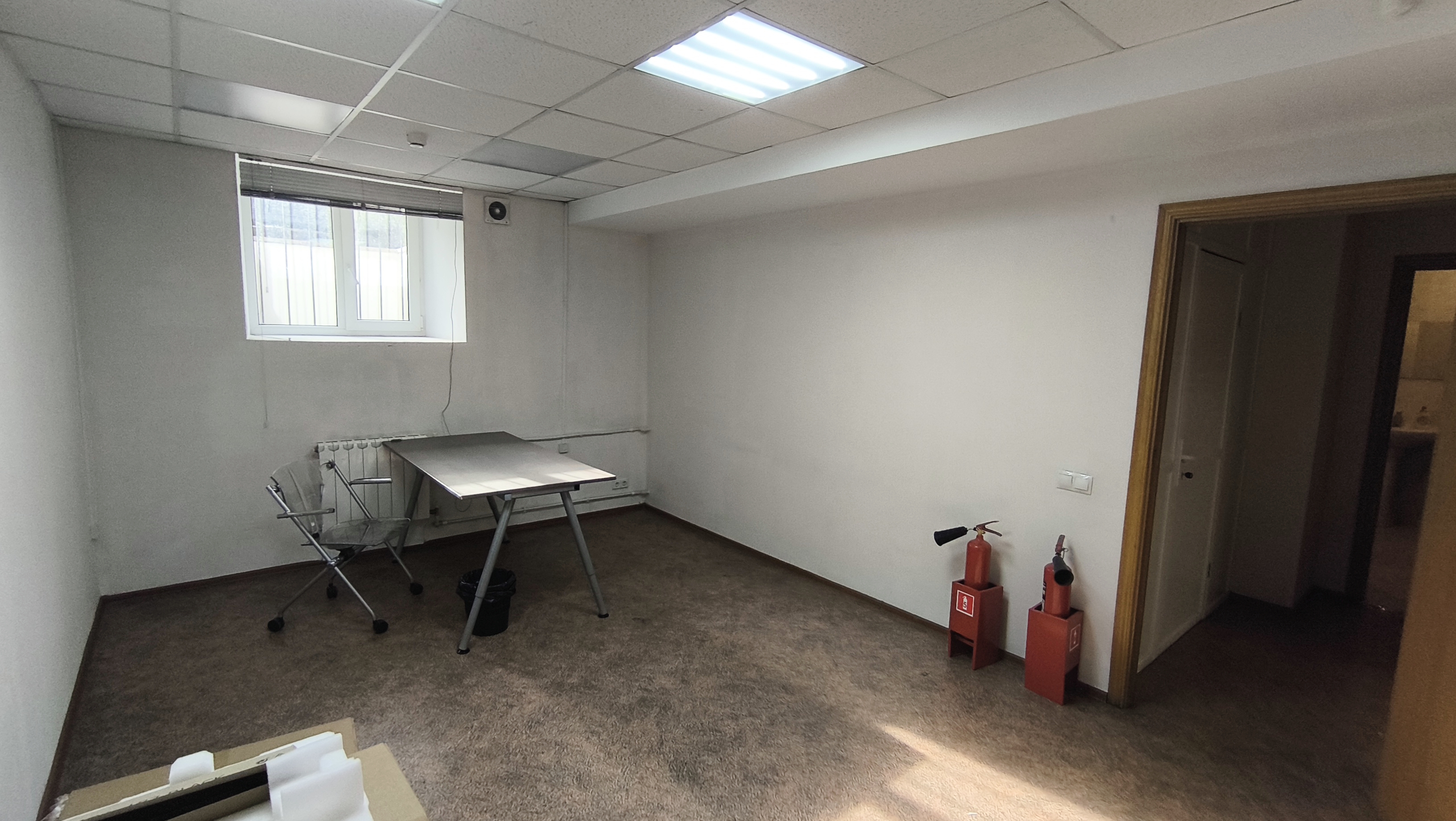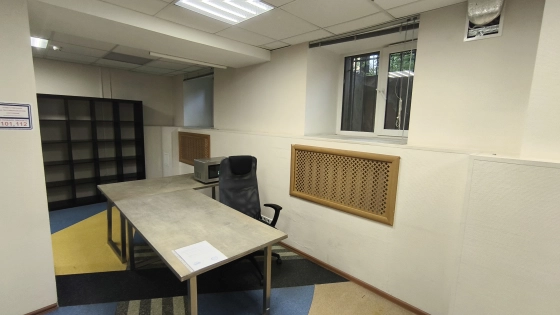 Офисное помещение на цокольном этаже здания, окна в приямках. Планировка 2 комнаты.