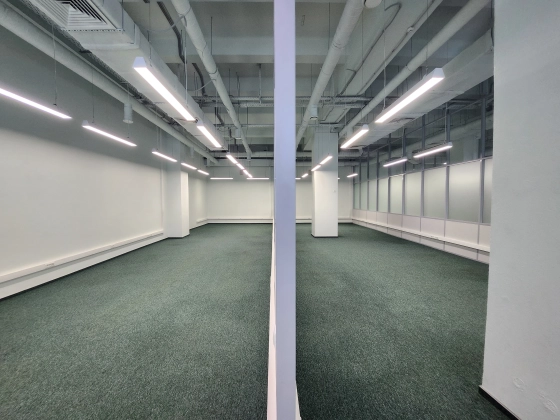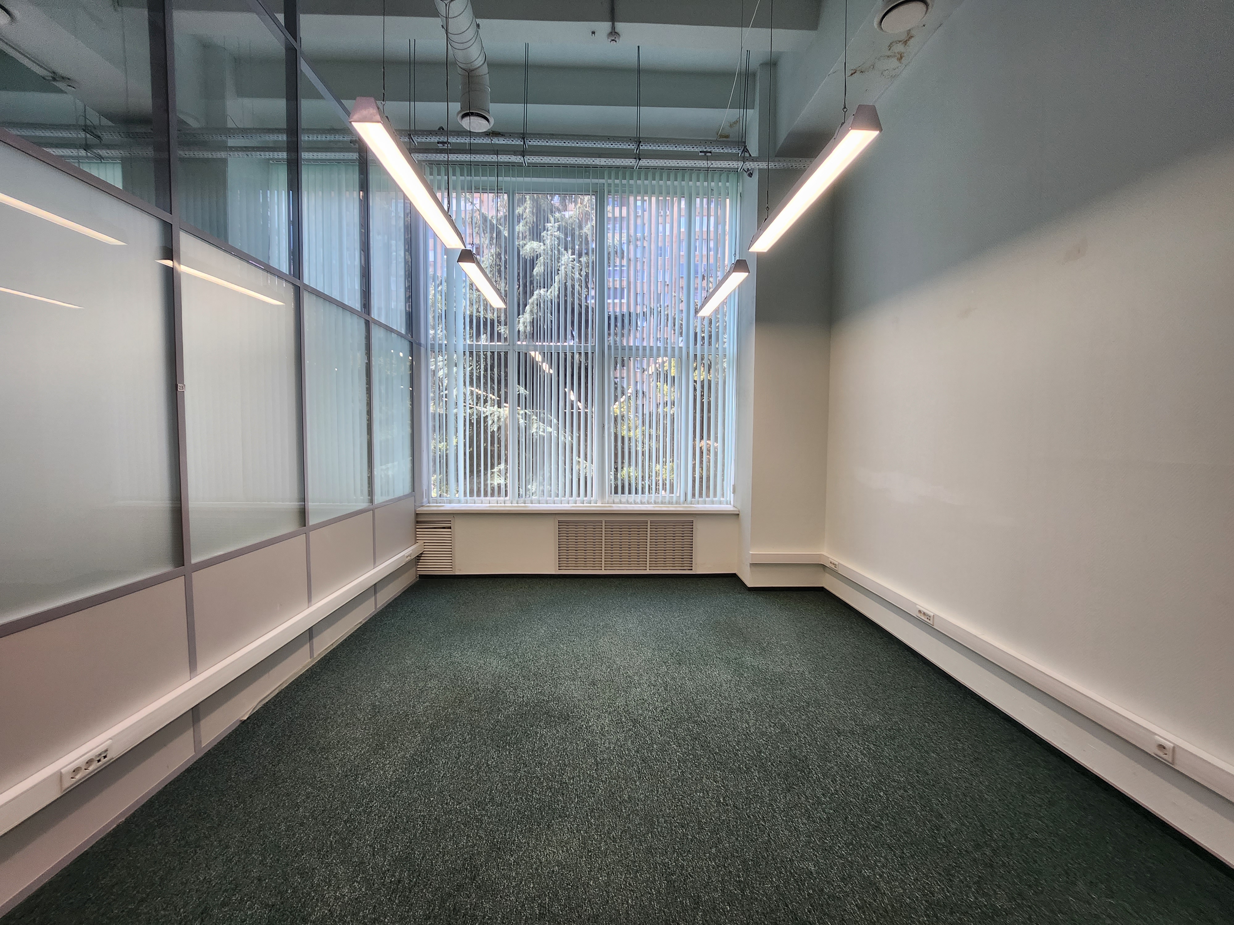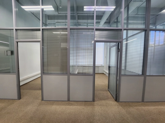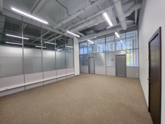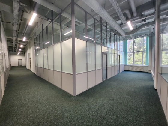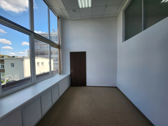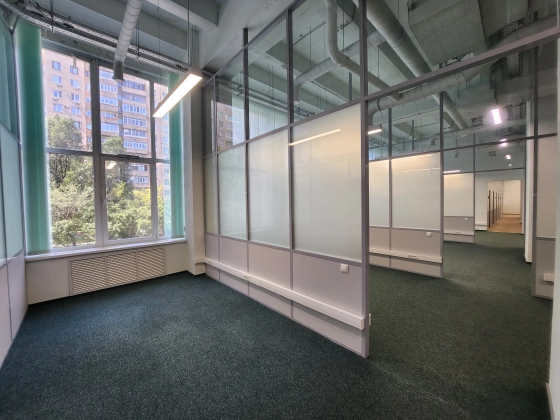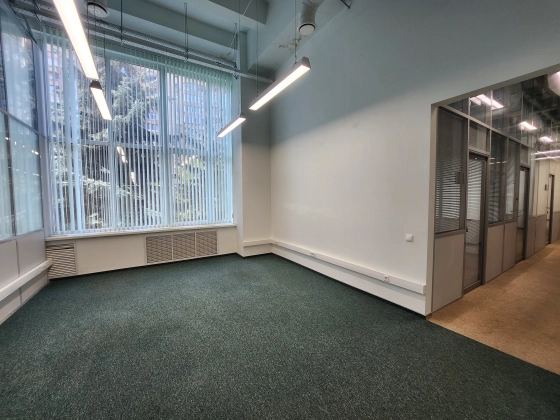 Офисное помещение с ремонтом, смешанная планировка. Большие окна, высокие потолки.